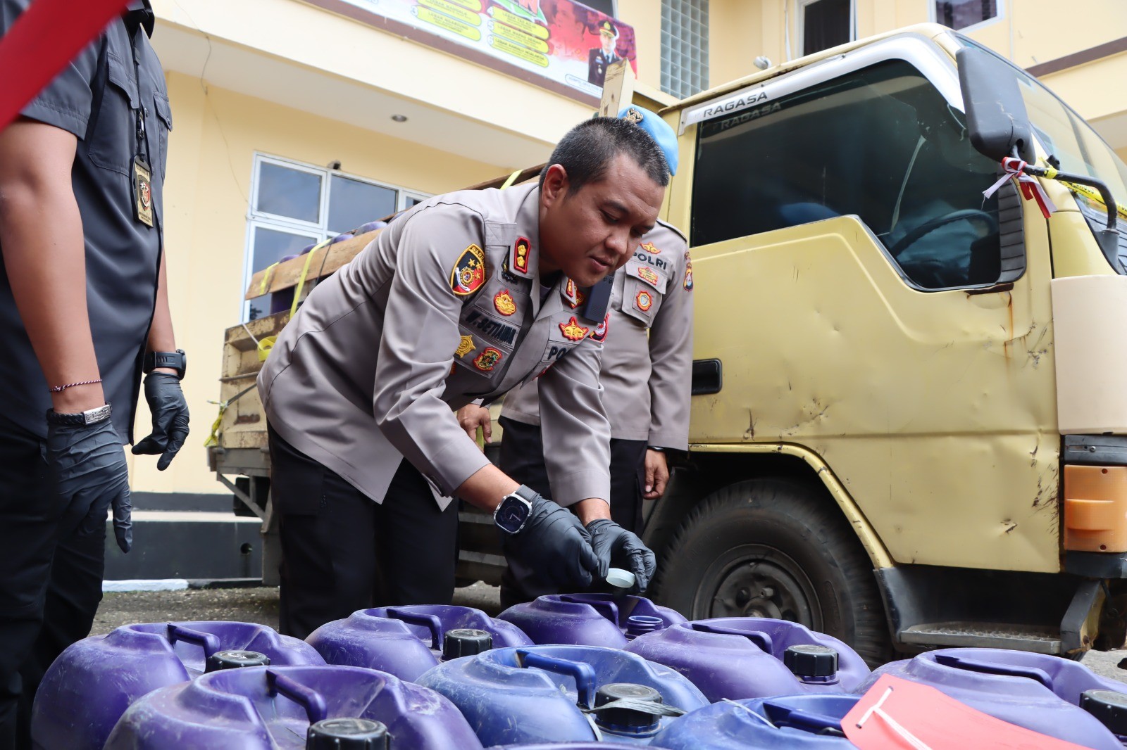 “Dari pengungkapan kasus tersebut kami berhasil mengamankan Pelaku AL(26) Warga Kecamatan Lebak Gedong dan dari tangan Pelaku, penyidik berhasil mengamankan 1 unit kendaraan truk engkel mitsubishi warna kuning No. Pol. F-8775-UH yang mengangkut 110 jerigen (ukuran 35 liter) yang semua jerigennya berisi BBM pertalite (total BBM pertalite yang diangkut 3 ton 850 liter) berikut kunci kontaknya dan 1 unit handphone yang digunakan tersangka untuk komunikasi,”