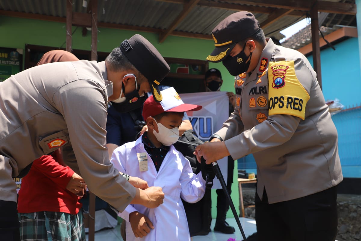 Polres Mojokerto membagikan seragam dan peralatan sekolah gratis ke 280 pelajar SD, SMP dan SMA untuk pembelajaran tatap muka (PTM). Polisi juga mengangkat 2 pelajar yang orang tuanya meninggal karena Covid-19 sebagai anak asuh.