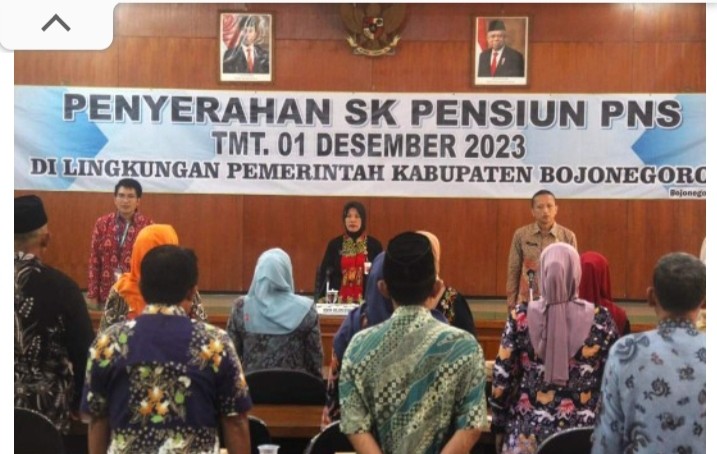 Sebanyak 40 Pegawai Negeri Sipil (PNS) di lingkup Pemkab Bojonegoro menerima Surat Keputusan (SK) purna tugas atau pensiun terhitung mulai tanggal (TMT) 1 Desember 2023. Kegiatan dilakukan di ruang Angling Dharma lt. 2 gedung Pemkab Bojonegoro, Kamis (14/12/2023).