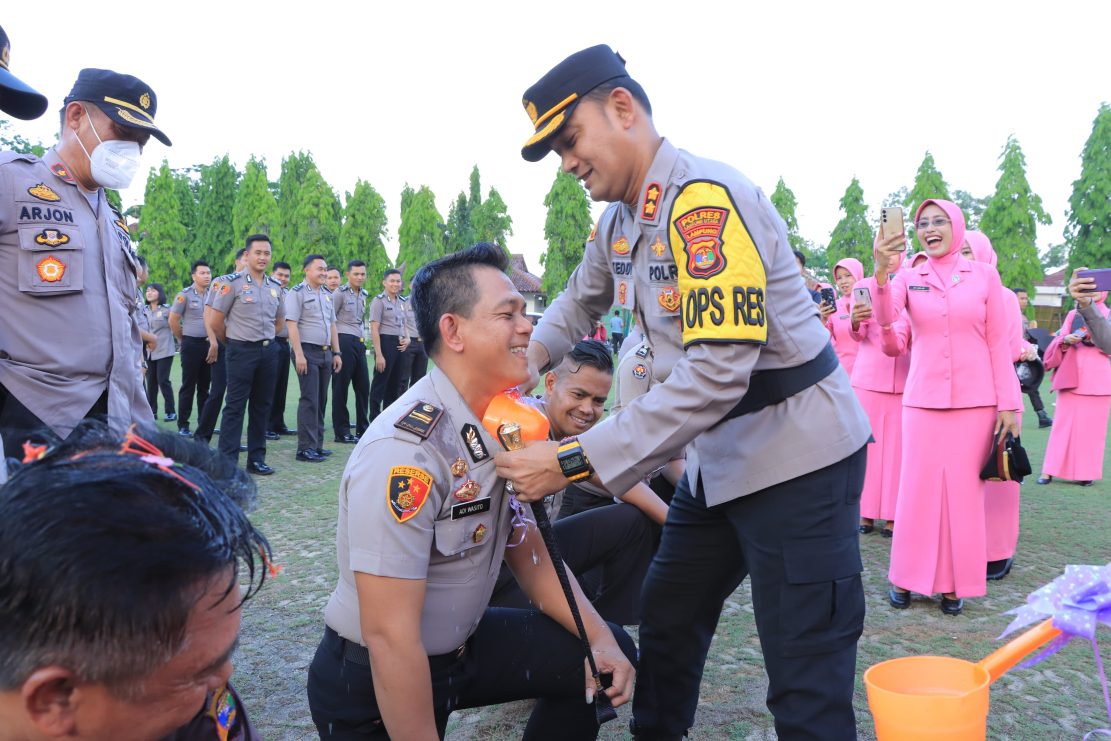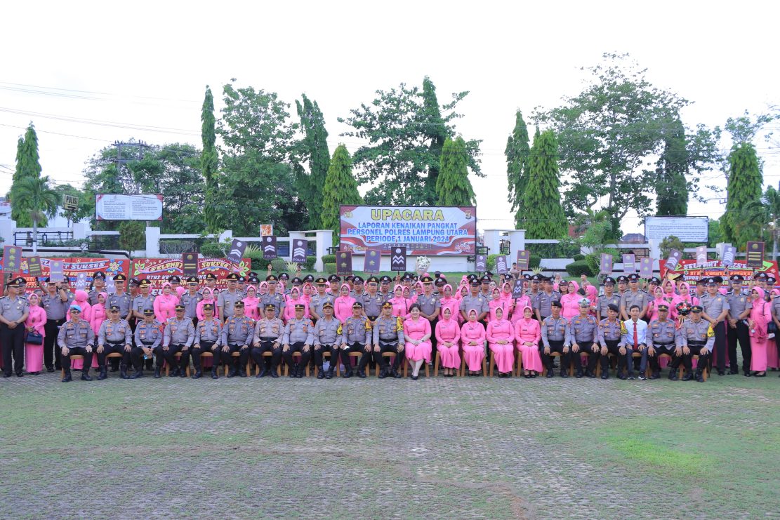 Kepala Kepolisian Resor Lampung Utara AKBP Teddy Rachesna, SH., S.I.K., M.Si. memimpin pelaksanaan upacara kenaikan pangkat 64 personel.