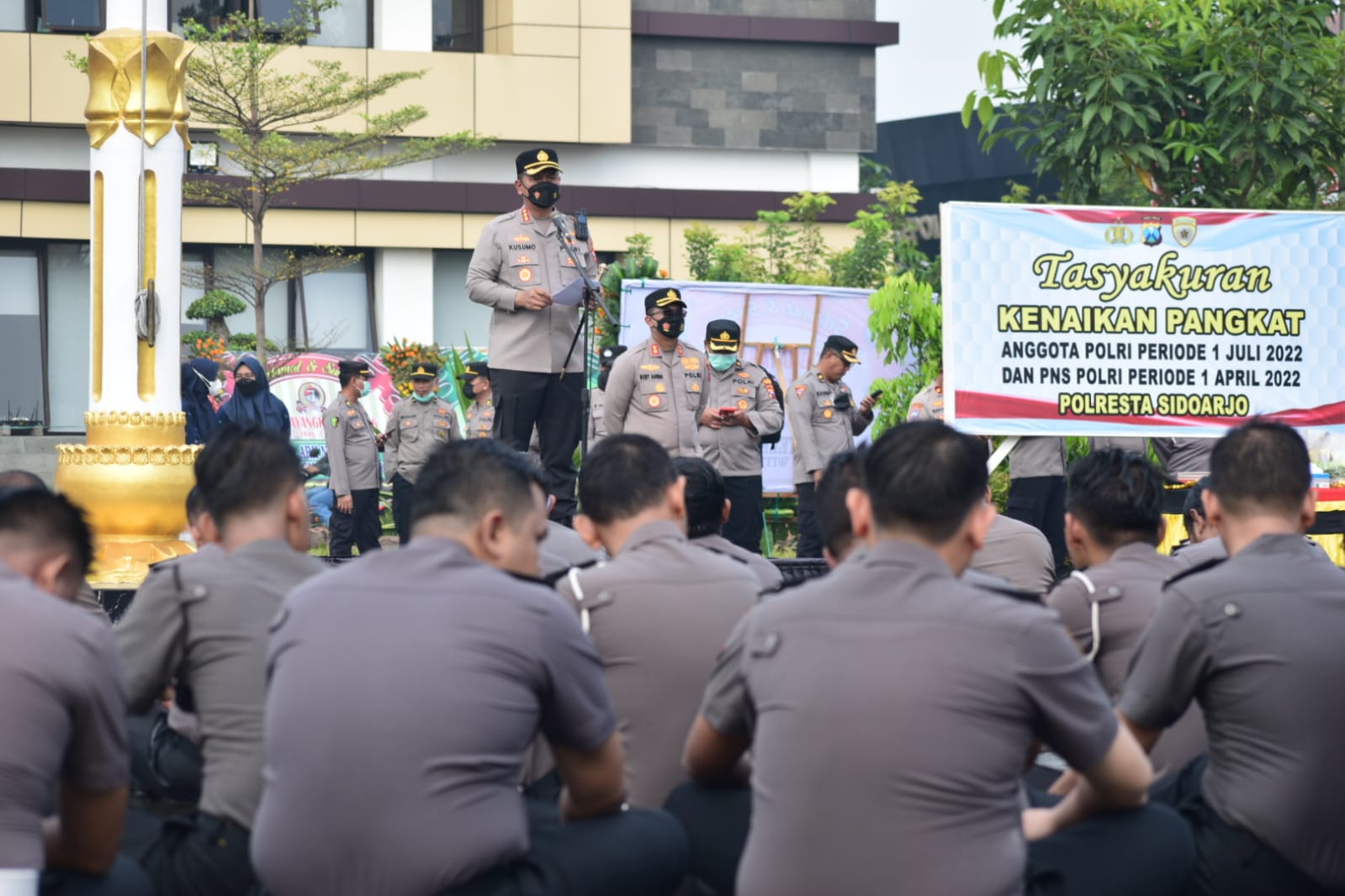 Sebanyak 80 personel Polri dan satu anggota Pegawai Negeri Pada Polri (PNPP) di lingkup Polresta Sidoarjo, Hari Bhayangkara ke-76 mendapatkan kado kenaikan pangkat setingkat lebih tinggi.