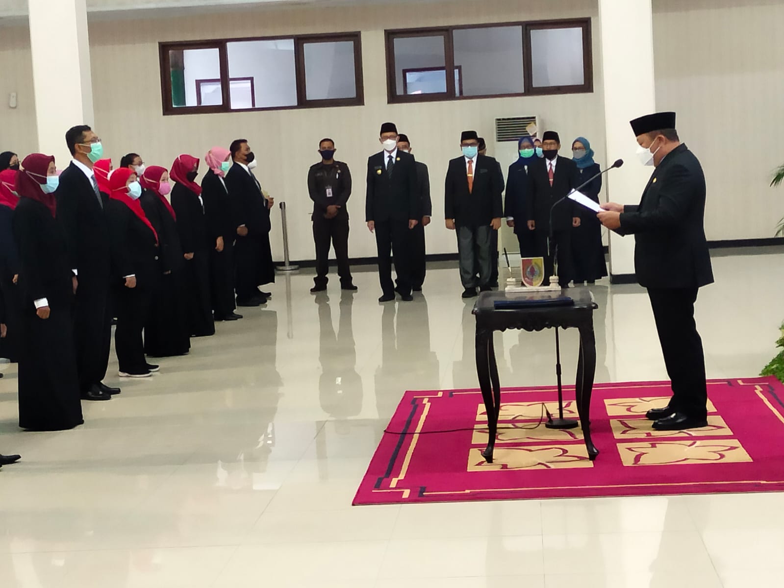 Bupati Jember, H Hendy Siswanto melantik 96 pejabat fungsional tertentu di pendopo Wahyawibawagraha Jum’at (30/04/2021). Saat pelantikan, terlihat Wakil Bupati Jember, M Firjaun Balya Barlaman dan Sekdakab Jember, Mirfano turut menyaksikan prosesi pelantikan 96 pejabat tersebut.