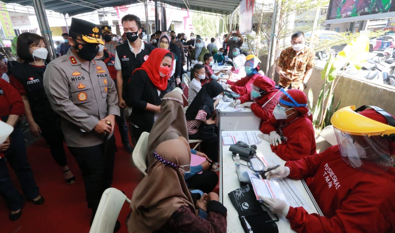 Kapolda Jawa Timur Irjen Pol Nico Afinta, bersama Pejabat Utama Polda Jatim, Sabtu (28/8/2021) melakukan pengecekan serbuan vaksinasi Merdeka, yang berlangsung di Wage Sidoarjo dan Mapolres Mojokerto Kabupaten. Masing-masing menyiapkan sebanyak 1000 dosis baik tahap satu maupun tahap dua.