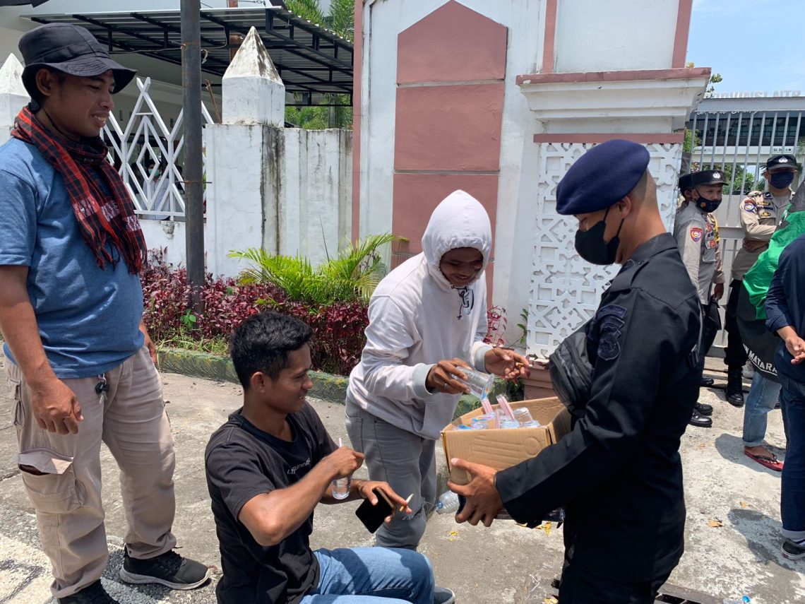 Dalam Pengamanan Humanis dan Simpatik tersebut, Anggota Brimob Polda NTB membagikan air mineral kepada para pengunjuk rasa.