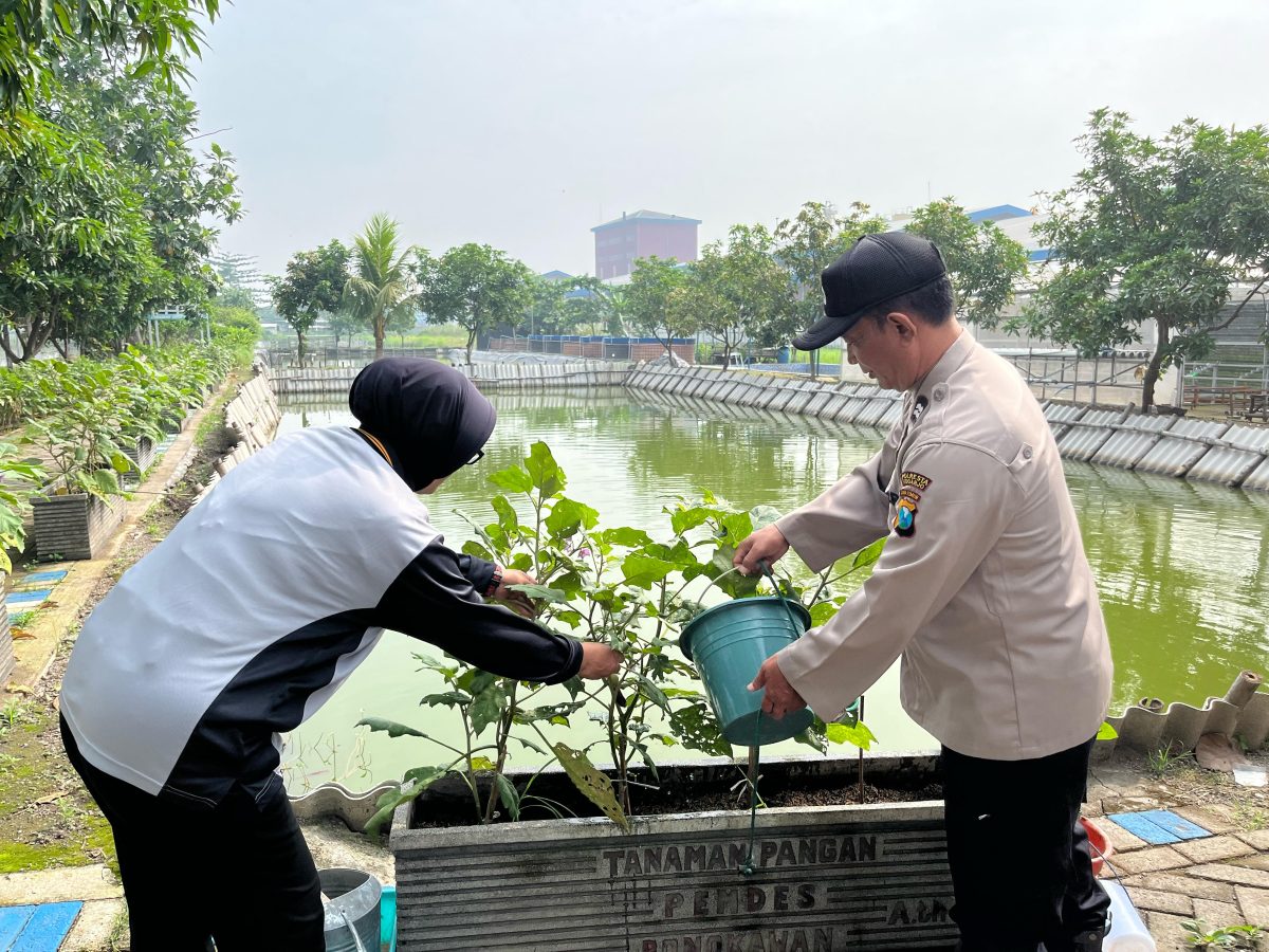 Dalam kegiatan tersebut, personel Polsek Krian bersama Pemdes dan masyarakat setempat melakukan penyiraman tanaman cabai, terong, dan tomat.