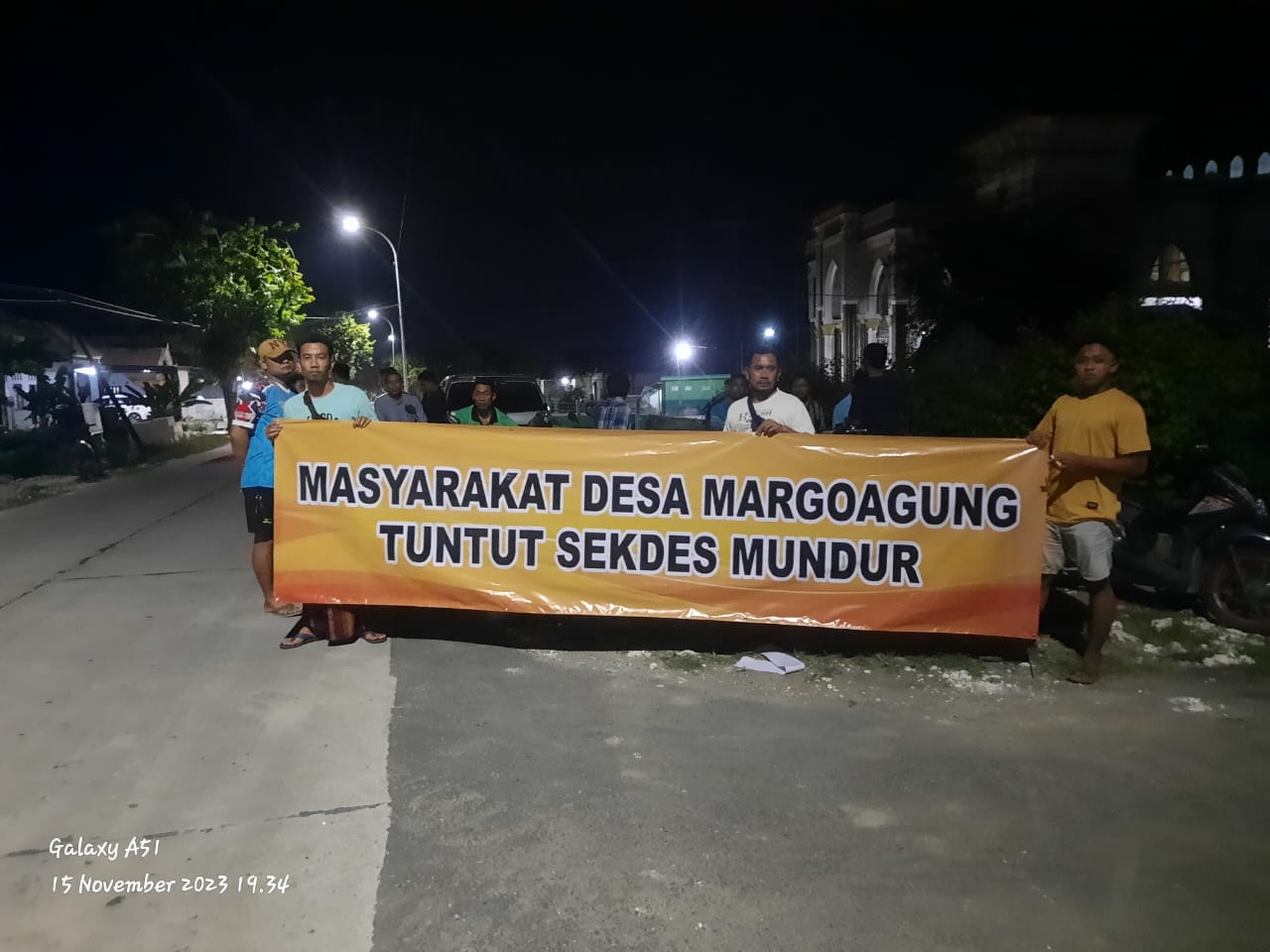 Dengan membentangkan banner, di depan Balai Desa Margoagung, warga menuntut Sekdes Margoagung untuk mundur dari jabatannya, hal ini lantaran, Sekdes dinilai sudah tidak lagi menjadi pengayom masyarakat Desa Margoagung yang didambakan.