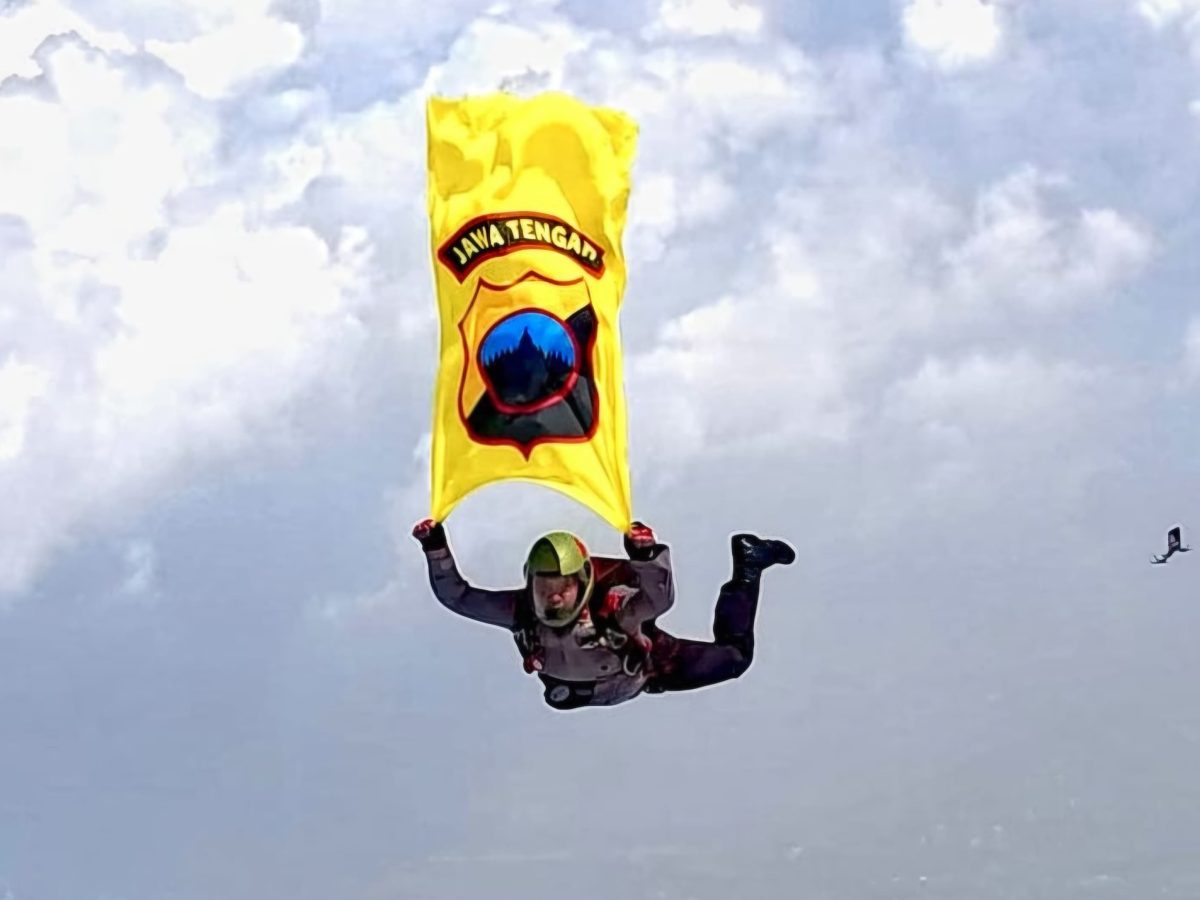 Aksi Spektakuler Kompol Heru Sanusi Kibarkan Logo Polda Jateng Saat Terjun di Acara Puncak Hari Bhayangkara ke-79