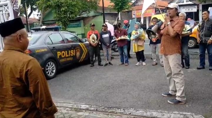 Ketua KPUD Sidoarjo M. Iskaq saat menyambut para unjuk rasa Aliansi Masyarakat Sidoarjo Dukung Kinerja KPUD Sidoarjo | FOTO: Gus