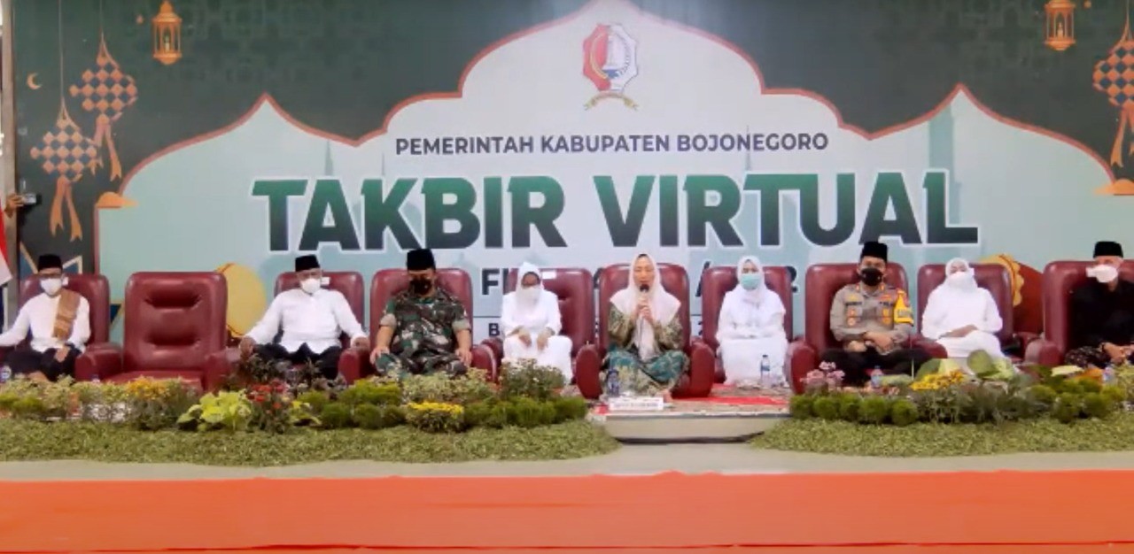 Pelaksanaan takbir virtual diikuti pula oleh Ibu Sekda, Staf Ahli, Asisten Sekda, Ketua PC NU Syuriah, Ketua LDII, tokoh masyarakat dan diringi oklek yang dibawakan seniman Bojonegoro, dengan tetap menerapkan protokol kesehatan pencegahan Covid-19. Dengan khusyu’, Bupati Anna bersama Forkopimda mengumandangkan takbir dari pendopo Pemkab, sementara Forpimcam dari pendopo kecamatan masing-masing.