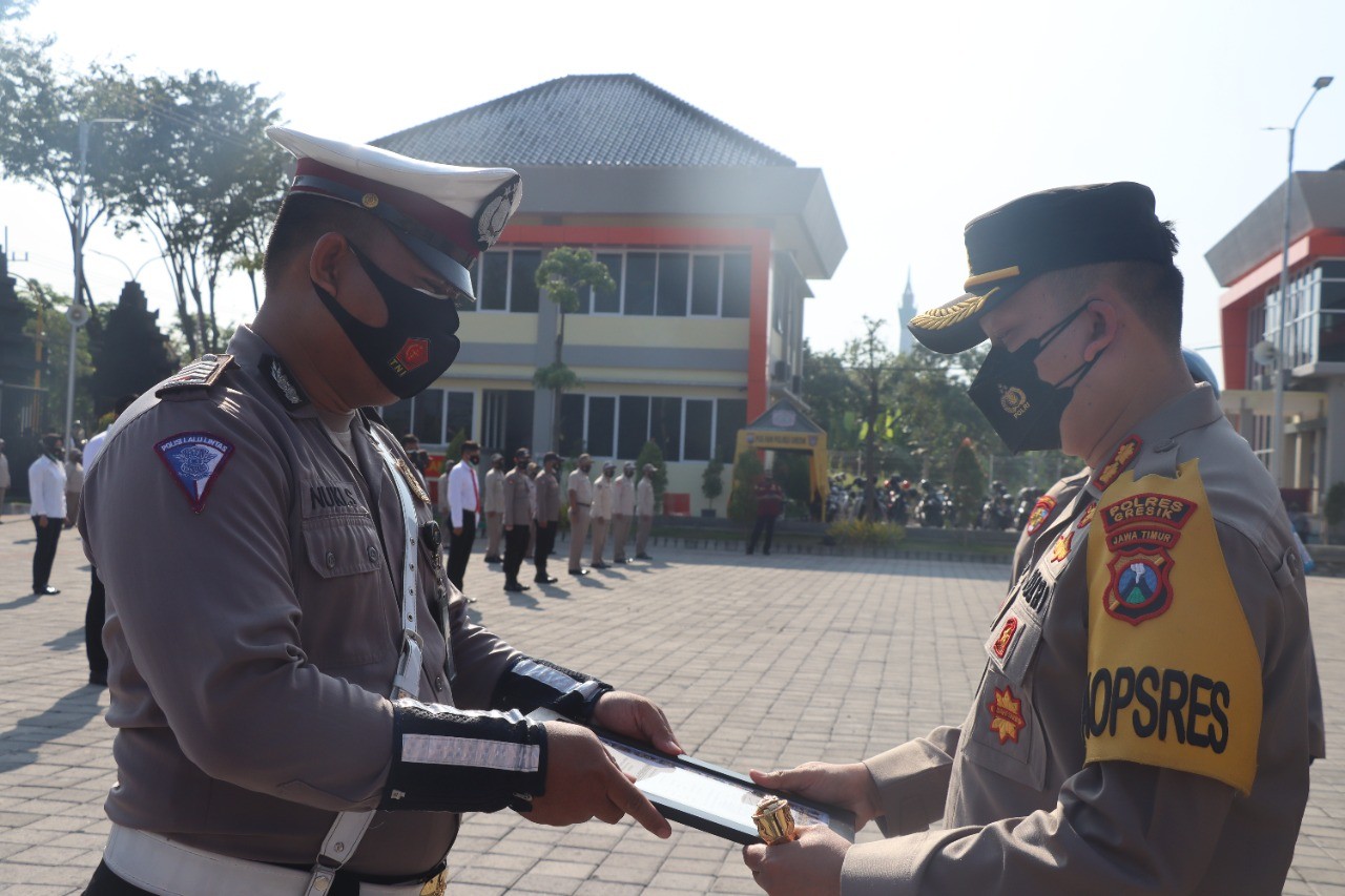 Sebagai bentuk apresiasi atas kinerja yang dilakukan anggota, Kapolres Gresik AKBP Arief Fitrianto,SH, SIK, MM.,memberikan reward kepadanya beserta delapan anggota lainnya pada apel pagi hari Senin, (2/8/2021) di halaman Mapolres Gresik.