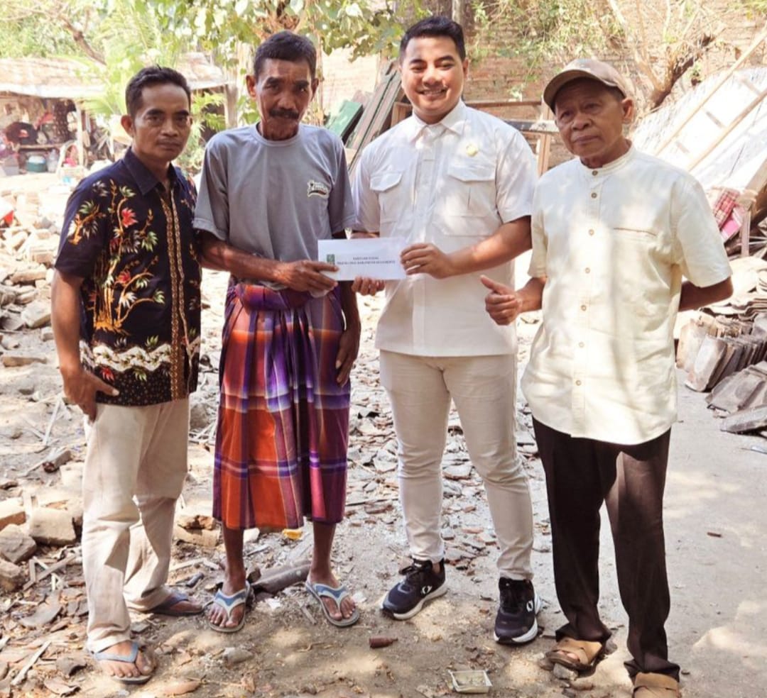 Anggota DPRD Kabupaten Mojokerto Akhmad Luthfy Ramadhani, S.Pd, M.Pd, Saat memberikan Bantuan uang Tunai Kepada Pak Malik yang rumahnya roboh rata dengan tanah