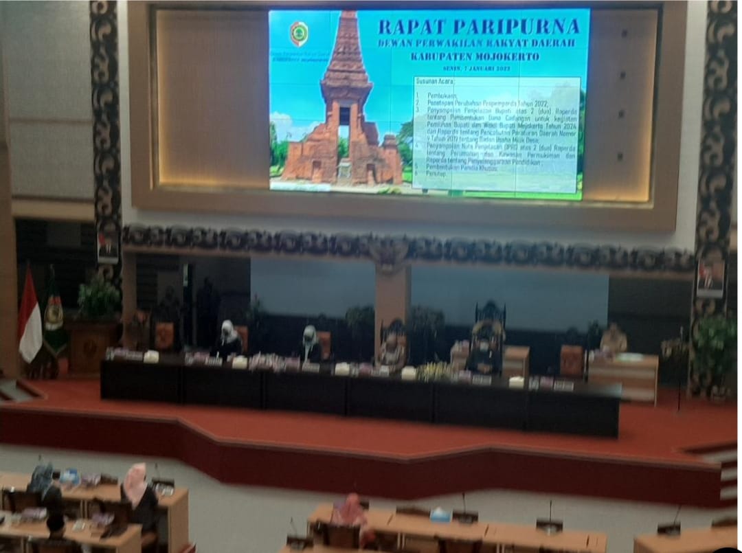 Anggota DPRD kabupaten Mojokerto mengelar rapat Paripurna diawal tahun 202 ini, Dalam Rapat Paripurna DPRD Kabupaten Mojokerto dengan agenda penyampaian penjelasan Bupati atas Dua Raperda tentang pembentukan dana cadangan untuk kegiatan pemilihan Bupati dan Wakil Bupati Mojokerto tahun 2024 dan Raperda tentang pencabutan peraturan daerah Nomor 9 tahun 2019 tentang Badan Usaha Milik Desa (BUMD)
