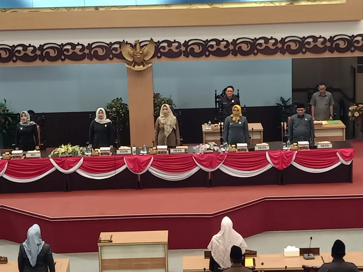 Anggota DPRD Kabupaten Mojokerto menggelar Rapat Paripurna dengan agendanya Penyampaian Nota Penjelasan Bupati atas Rancangan Kebijakan Umum APBD (KUA) dan Prioritas Plafon Anggaran Sementara (PPAS) PAPBD Tahun Anggaran 2023 di ruang Graha Whicesa, Gedung DPRD Kabupaten Mojokerto, Senin (7/8/2023).