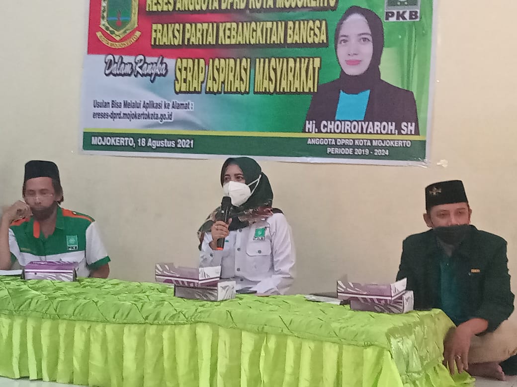 Anggota DPRD Kota Mojokerto dari Fraksi PKB Hj. Choiroiyaroh, SH menggelar acara Serap Aspirasi Masyarakat (RESES ) pelaksanakaan kegiatan di Aula Shahidur Rahman, Keradenan III Kelurahan Kauman, Kecamatan Prajurit Kulon, Rabu (18/8/2021) sore.