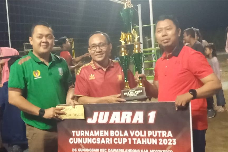 Anggota DPRD Kabupaten Mojokerto dari Partai Gerindra Sujatmiko, S.Pd, M.Si, bersama Kepala Dinas Budporapar Kabupaten Mojokerto Norman Handhito SIP MSi menyerahkan Piala dan uang pembinaan juara 1 Turnamen Bola Volly Gunungsari Cup 1 kepada Club Bola Volly Putra Volga dari Desa Bangeran dan Juara II kepada Club Bola Volly Galaxy dari Desa Jatirowo Kecamatan Dawarblandong, Rabu malam ( 27 / 09 / 2023 ).
