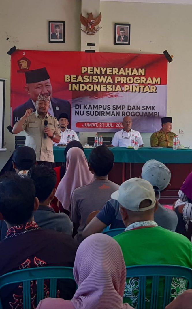 H . Sumail Abdullah Anggota Komisi V Dewan Perwakilan Rakyat (DPR) RI dari Partai Gerindra, secara simbolis menyerahkan bantuan beasiswa Program Indonesia Pintar (PIP) di SMKNU Sudirman Mangir Rogojampi, dan acara tersebut bertempat di Aula SMKNU Sudirman, Jumat. (21/7/2023).