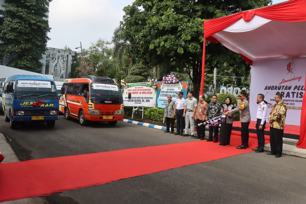 Wakapolres Bojonegoro, Kompol Yoyok Dwi Purnomo menghadiri launching Angkutan Pelajar Gratis di Halaman Pendopo Malowopati Pemkab Bojonegoro, Kamis (6/3/2025).