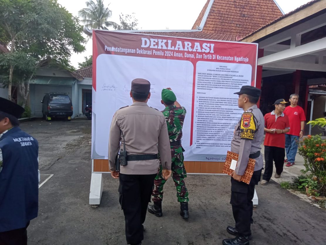 Wujud komitmen bersama untuk memastikan keamanan dan kelancaran Pemilu, Polsek Ngadirojo Polres Wonogiri mengikuti apel Deklarasi Damai Pemilu 2024 yang di laksanakan di Halaman Kecamatan Ngadirojo, Jumat (12/1/2024).