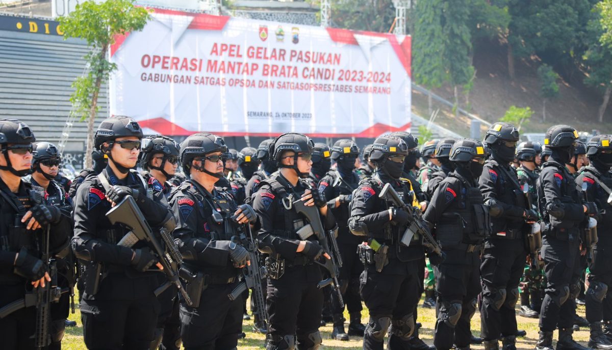 Polda Jateng menggelar apel gelar pasukan Operasi Mantap Brata (OMB) Candi 2023 di Lapangan Parade Kodam IV/Diponegoro, pada Rabu (18/10). Apel itu dalam rangka pengamanan rangkaian pemilu sejak 2023 hingga 2024.