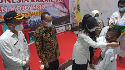 dalam kesempatan ini mengalungkan medali dan menyerahkan sertifikat piagam penghargaan Kejuaraan tersebut kepada para atlit Karate Puslatcab itu. Dikatakan oleh Ikfina Fatmawati, meski dalam kondisi pandemi covid 19, anak-anak harus tetap berprestasi. Meski, secara virtual. Sebagai generasi penerus bangsa, para atlit Karate Puslatcab Kabupaten Mojokerto, bisa mengharumkan nama Kabupaten Mojokerto baik secara nasional maupun internasional. Semoga di Kejuaraan Porprov 2022 nanti, mampu menorehkan medali dan kembali mengharumkan nama Kabupaten Mojokerto Jawa Timur. Sementara, Pelatih Karate Do Shito Ryu (Satria Majapahit), Saprianus. Mengaku bangga kepada anak asuhnya, yang telah berjuang keras untuk mendapatkan medali emas,perak dan perunggu. Menurutnya, sudah cukup lama penantian ini, keluar sebagai juara umum, dalam Kejuaraan Karate Nasional maupun Internasional. ” Perlu Kami Sampaikan, bahwa baru pertama kali dalam sejarah, Kita meraih juara umum,” kata SaprianuS kepada Bupati Ikfina.. ( kar/har)