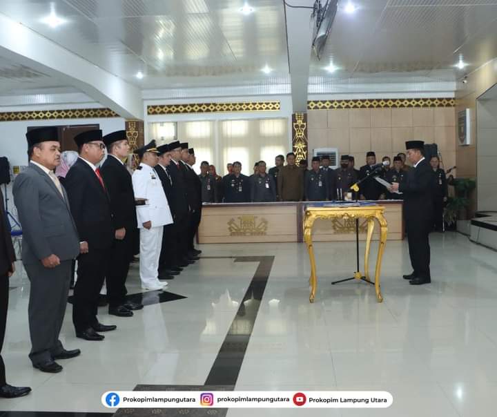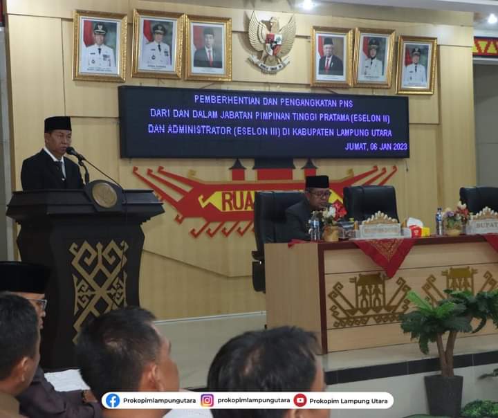Awal tahun 2023, Bupati Lampung Utara H. Budi Utomo, SE, MM. melantik Pejabat Pimpinan Tinggi Pratama dan Pejabat Administrator di Lingkungan Pemerintah Kab. Lampung Utara di Ruang Tapis Setdakab Lampung Utara. Jumat (06/01/2023).