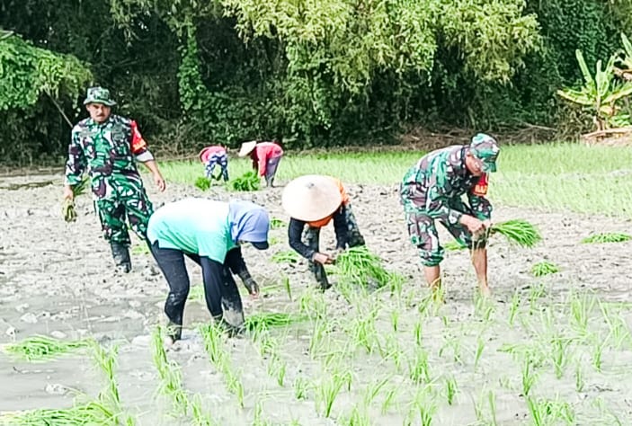 Salah satu upaya tersebut, seperti yang dilakukan oleh jajaran Bintara Pembina Desa atau Babinsa Koramil 0813-09/Sumberrejo dengan membantu petani menanam bibit padi di sawah milik warga Desa Mlinjeng Kecamatan Sumberrejo Kabupaten Bojonegoro, Selasa (8/4/2025).
