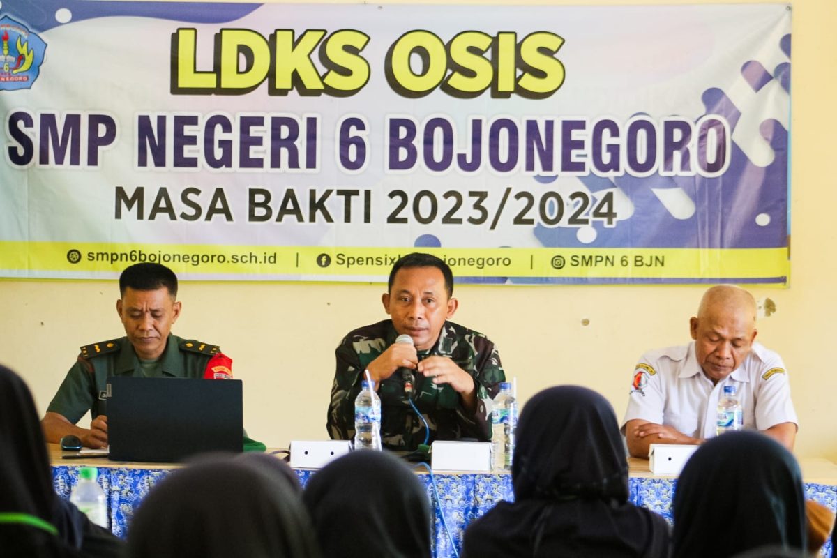 Jajaran Bintara Pembina Desa (Babinsa) Koramil 0813-01/Bojonegoro, memberikan pembinaan Wawasan Kebangsaan (Wasbang) kepada 35 orang siswa dan Siswi pengurus Organisasi Siswa Intra Sekolah (OSIS) Sekolah Menengah Pertama (SMP) Negeri 6 Bojonegoro dalam kegiatan Latihan Dasar Kepemimpinan Siswa (LDKS) di Aula sekolah setempat, Rabu (22/11/2023).