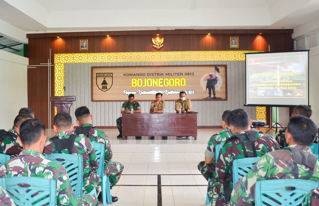 Dalam rangka menindaklanjuti persebaran virus Penyakit Mulut dan Kuku (PMK) yang mengancam hewan ternak berkuku genap dan belah seperti sapi, kambing, kerbau, dan domba, Bintara Pembina Desa (Babinsa) jajaran Kodim 0813 Bojonegoro turut mengikuti sosialisasi penanganan PMK oleh Dinas Peternakan Kabupaten Bojonegoro, di Gedung Ahmad Yani Makodim setempat, Senin, (4/7/2022).