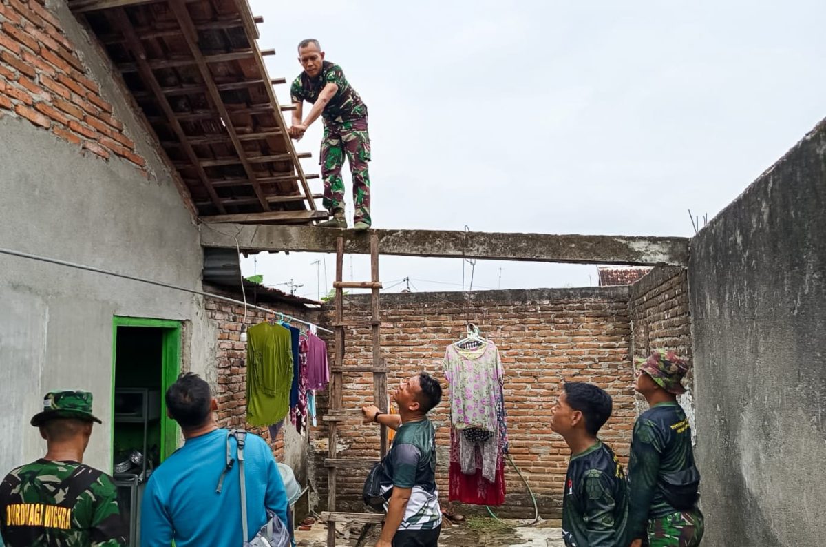 Bersama Perangkat Desa dan puluhan warga RT.028 dan RT.006/RW.001 Desa Campurejo, Selasa (30/9/2025), jajaran Bintara Pembina Desa atau Babinsa Koramil 01/Bojonegoro Kodim 0813 Bojonegoro melaksanakan karya bakti membantu pemasangan genteng rumah warga yang rusak akibat hujan deras disertai angin kencang.