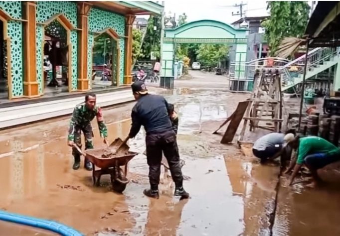 Bintara Pembina Desa atau (Babinsa) Koramil 05/Dander Kodim 0813 Bojonegoro, Sertu Wahyu Yasin, gotong-royong membantu warga diwilayah binaan dengan membersihkan sisa-sisa lumpur yang ada di area Masjid Ar-Rahman Desa/Kecamatan Dander akibat bencana banjir bandang, Sabtu (2/12/2023).