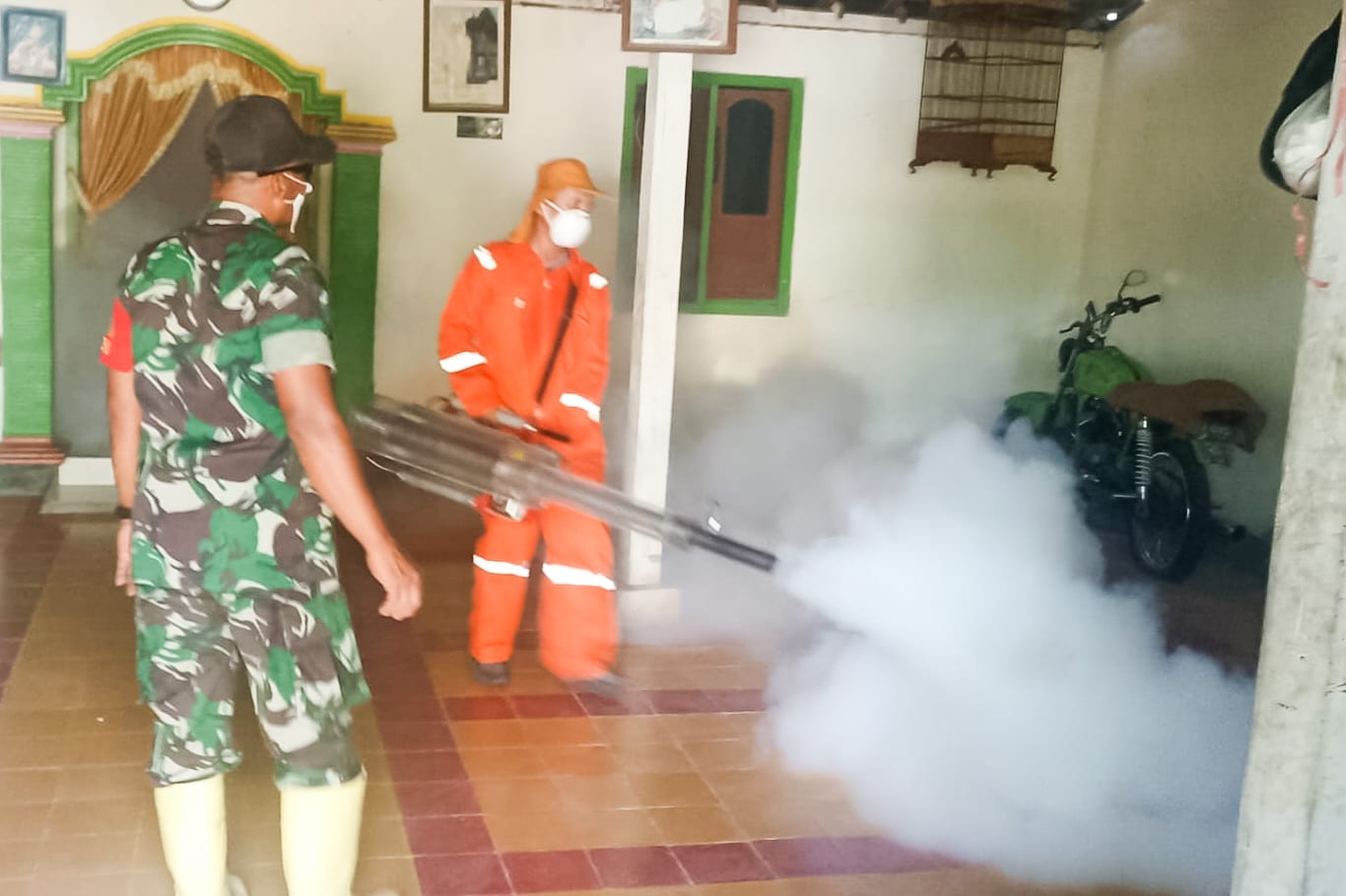 Babinsa Koramil Sukosewu Bojonegoro dampingi Petugas Dinkes Lakukan Fogging. | Foto: Ist