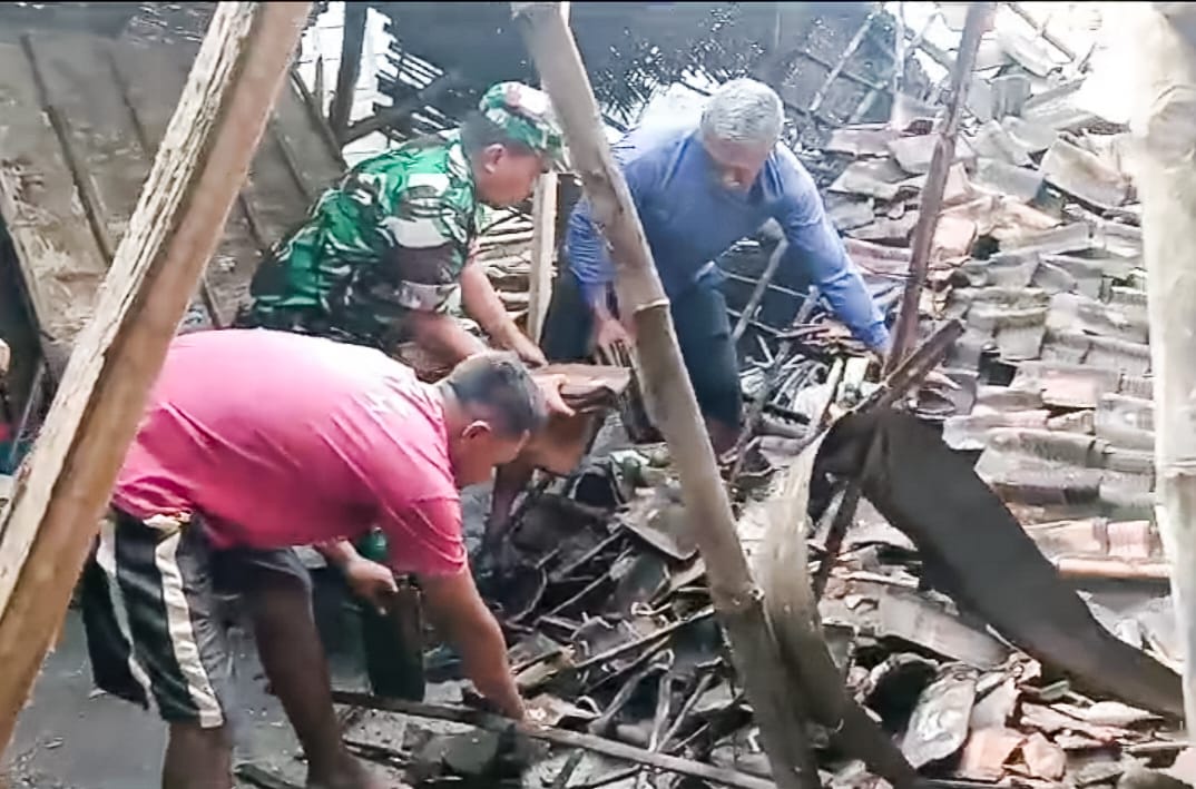 Bintara Pembina Desa (Babinsa) Koramil 09/Sumberrejo Kodim 0813 Bojonegoro, Serda Suyatno, bersama warga melaksanakan karya bakti membersihkan puing-puing reruntuhan bangunan dapur rumah roboh milik Arbani (50) warga Dusun Pacul RT.007 RW.002 Desa Kayulemah Kecamatan Sumberrejo Kabupaten Bojonegoro.