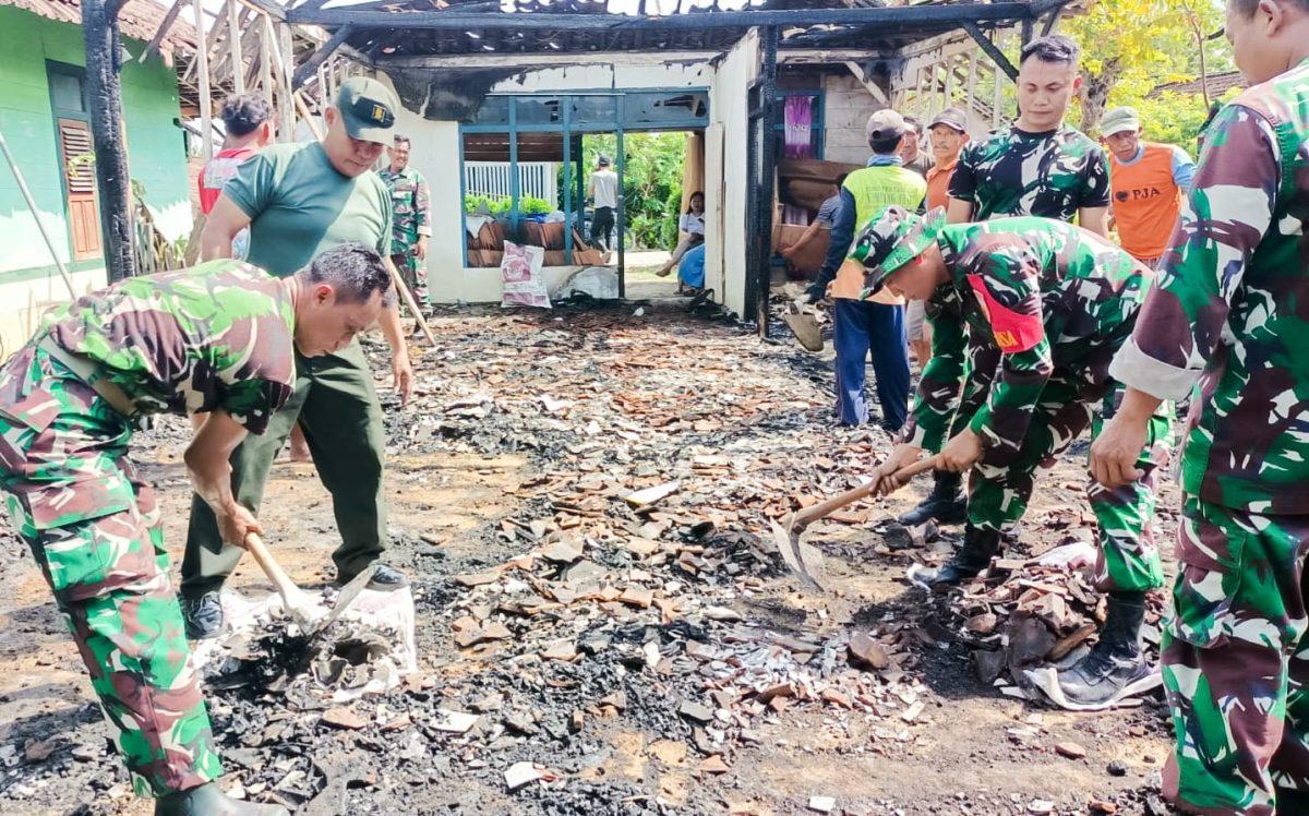 Jajaran Bintara Pembina Desa (Babinsa) Koramil 24/Temayang Kodim 0813 Bojonegoro, melaksanakan karya bakti membantu membersihkan puing-puing sisa kebakaran rumah milik Budi Doyo Slamet (55), warga Dusun Babatan RT.005/RW.002 Desa Kedungsari Kecamatan Temayang Kabupaten Bojonegoro, Rabu (23/10/2024).