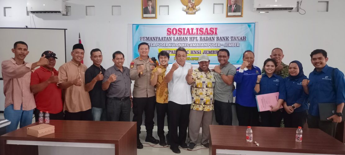 Sosialisasi pemanfaatan lahan HPL Badan Bank Tanah desa Puger kulon kecamatan Puger kabupaten Jember Jawa Timur kepada DPC ( HNSI ) bertempat di pendopo Wisnu Graha Tama kecamatan Puger kabupaten Jember Jawa Timur.