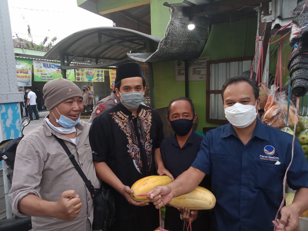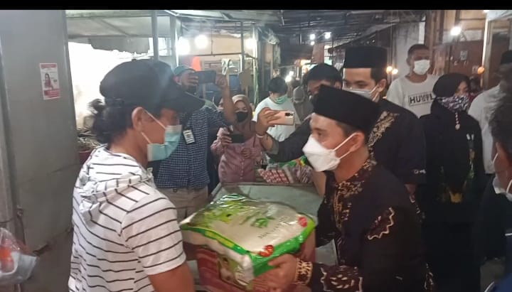 Bagi Bagi Sembako dan Sosialisasi PPKM di Pasar Kutorejo, Gus Barra Didampingi Putra Gubernur Jatim