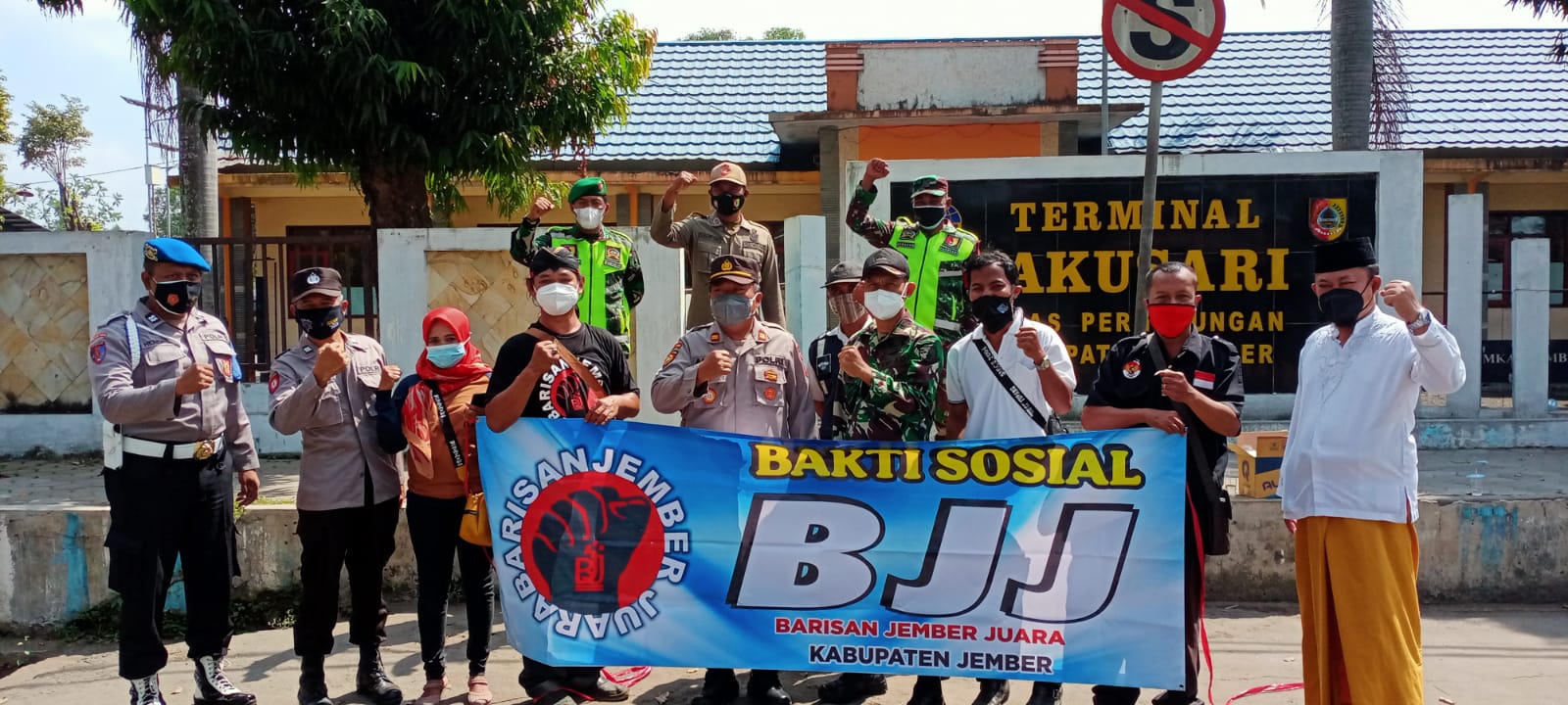 Lembaga Sosial Budaya. BJJ ( barisan Jember Juara ) membagi bagikan masker secara gratis serta melakukan Himbauan pengendara sepeda serta Patuhi Protokol kesehatan (Prokes) covid-19 di masa PPKM. di Depan Terminal pakusari. Jumat pagi,( 30/Juli/2021).