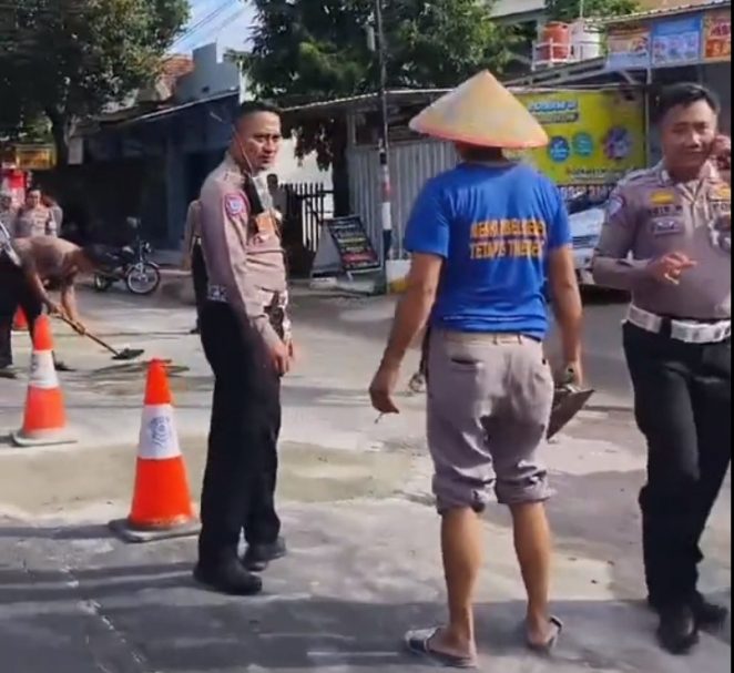 Dengan menggunakan alat seadanya, anggota Satlantas Polres Bondowoso menambal jalan menggunakan semen dan pasir.