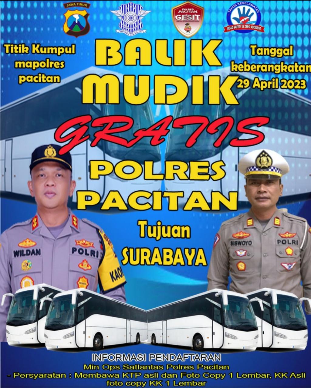 Melaksanakan program Balik Mudik Gratis Polda Jatim pada lebaran Idul Fitri 1444 H/2023, Polres Pacitan menyiapkan armada bus gratis untuk warga Kabupaten Pacitan yang akan balik mudik tujuan Surabaya.
