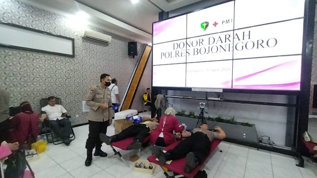 Untuk memenuhi stok darah, Polres Bojonegoro bekerjasama dengan Palang Merah Indonesia (PMI) Cabang Bojonegoro menggelar donor darah di Gedung AP I Rawi Polres Bojonegoro, Selasa (30/4/2024).