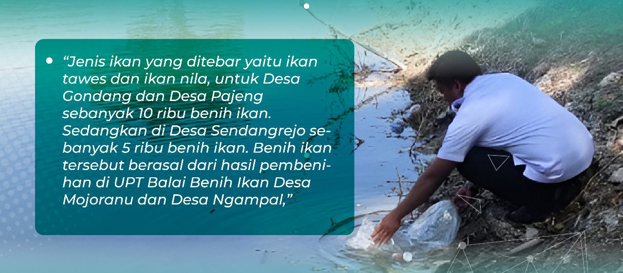 “Jenis ikan yang ditebar yaitu ikan tawes dan ikan nila, untuk Desa Gondang dan Desa Pajeng sebanyak 10 ribu benih ikan. Sedangkan di Desa Sendangrejo sebanyak 5 ribu benih ikan. Benih ikan tersebut berasal dari hasil pembenihan di UPT Balai Benih Ikan Desa Mojoranu dan Desa Ngampal,” tuturnya.
