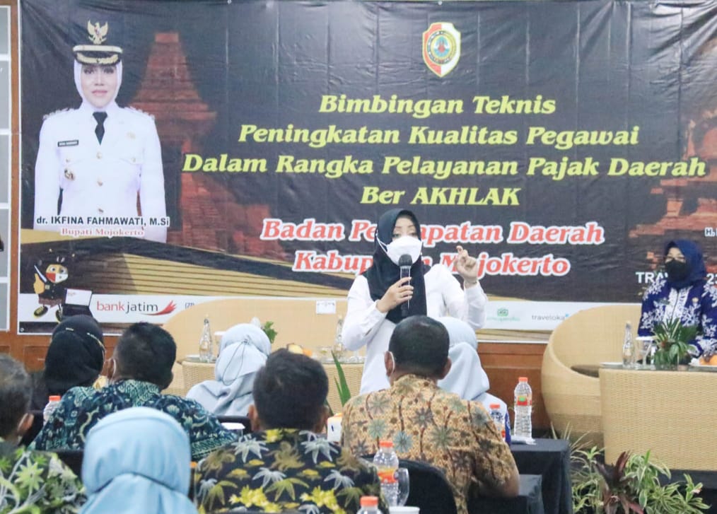 Bupati Mojokerto dr.Ikfina Fahmawati, M.Si. menjadi narasumber dalam agenda Bimbingan Teknis (Bimtek) Peningkatan Kualitas Pegawai Badan Pendapatan Daerah (Bapenda) Kabupaten Mojokerto, Rabu (23/2). Dalam kesempatan ini, Ikfina memberikan materi dan motivasi untuk para pegawai baik ASN maupun non-ASN untuk menerapkan core values BERAKHLAK yang telah ditetapkan oleh pemerintah pusat.