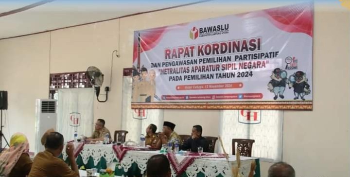 Badan Pengawas Pemilu (Bawaslu) Kabupaten Lampung Utara menyelenggarakan Rapat Koordinasi dan Pengawasan Pemilihan Partisipatif bertemakan “Netralitas Aparatur Sipil Negara” dalam rangka persiapan Pemilu 2024. Selasa, 12 November 2024.