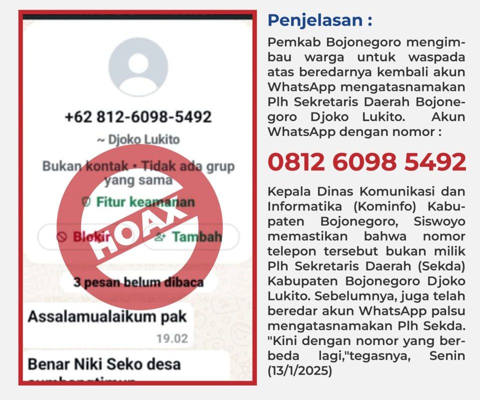 Kepala Dinas Komunikasi dan Informatika (Kominfo) Kabupaten Bojonegoro, Siswoyo memastikan bahwa nomor telepon tersebut bukan milik Plh Sekretaris Daerah (Sekda) Kabupaten Bojonegoro Djoko Lukito. Sebelumnya, juga telah beredar akun WhatsApp palsu mengatasnamakan Plh Sekda. “Kini dengan nomor yang berbeda lagi,”tegasnya, Senin (13/1/2025).