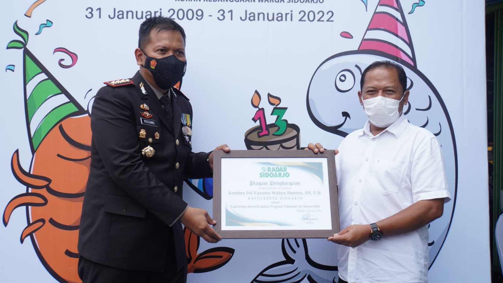 Direktur PT Radar Media Surabaya Lilik Widiantoro mengatakan, penghargaan pada peringatan ulang tahun Radar Sidoarjo ke-13 yang diberikan kepada Kapolresta Sidoarjo, karena berkat segala terobosan yang dilakukan dalam memberikan pelayanan vaksinasi ke masyarakat secara cepat dan menyeluruh.