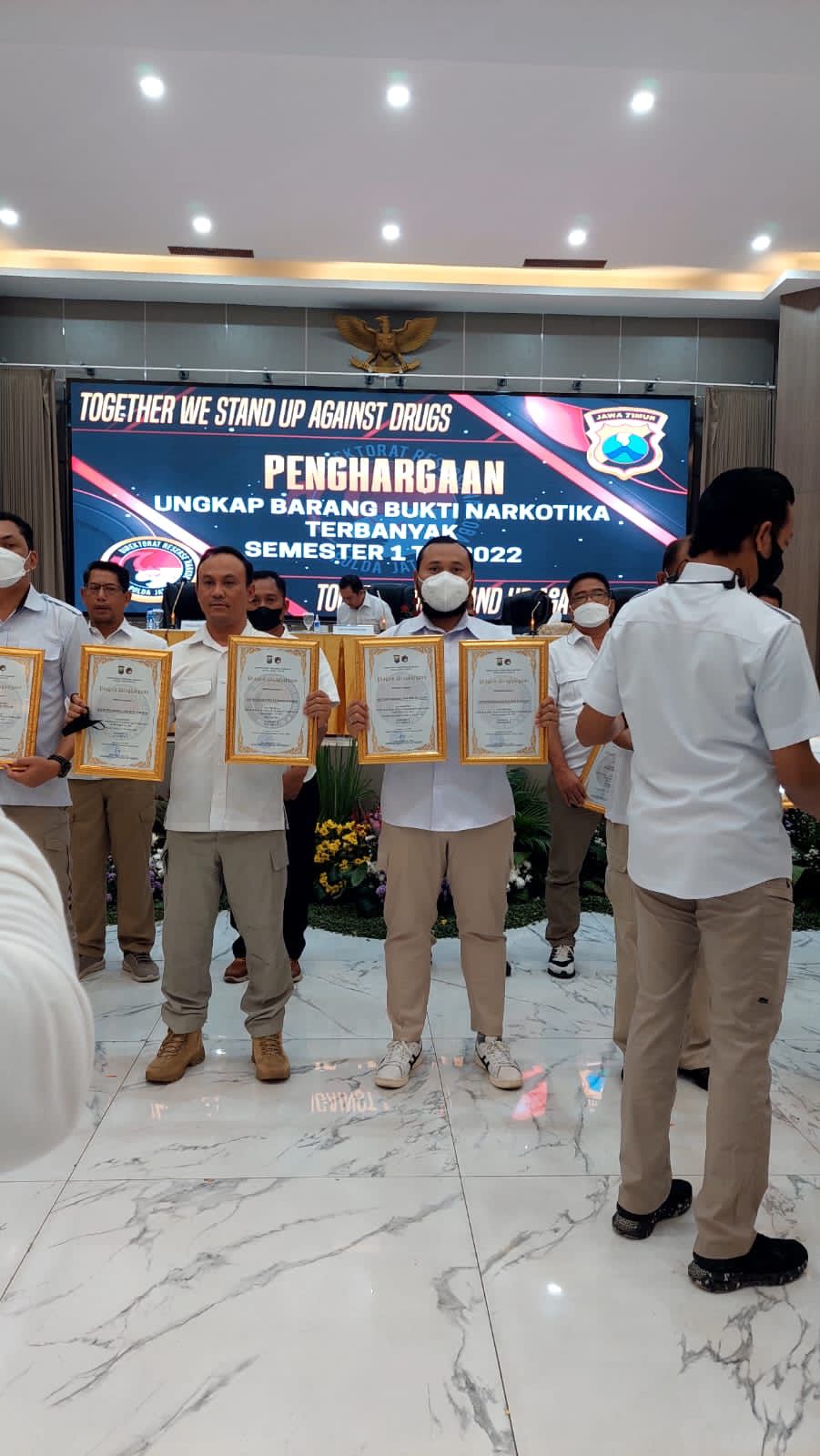 “Alhamdulillah, kerja keras tim kami dalam memberantas peredaran narkoba di Kabupaten Jember, terbayar dengan reward dari Ditreskoba Polda Jatim sebagai satuan yang paling banyak berhasil ungkap narkoba, semua ini berkat kerjasama tim yang solid,” ujar Kasatreskoba Polres Jember AKP. Sugeng Iryanto SH.
