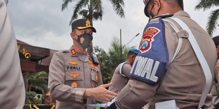 Kapolres Malang, AKBP Ferli Hidayat pimpin upacara kenaikan pangkat pengabdian anggota Polres Malang sekaligus Pemberian Penghargaan kepada anggota berprestasi di Lapangan Satya Haprabu Mapolres Malang, Senin (6/6/2022) siang.
