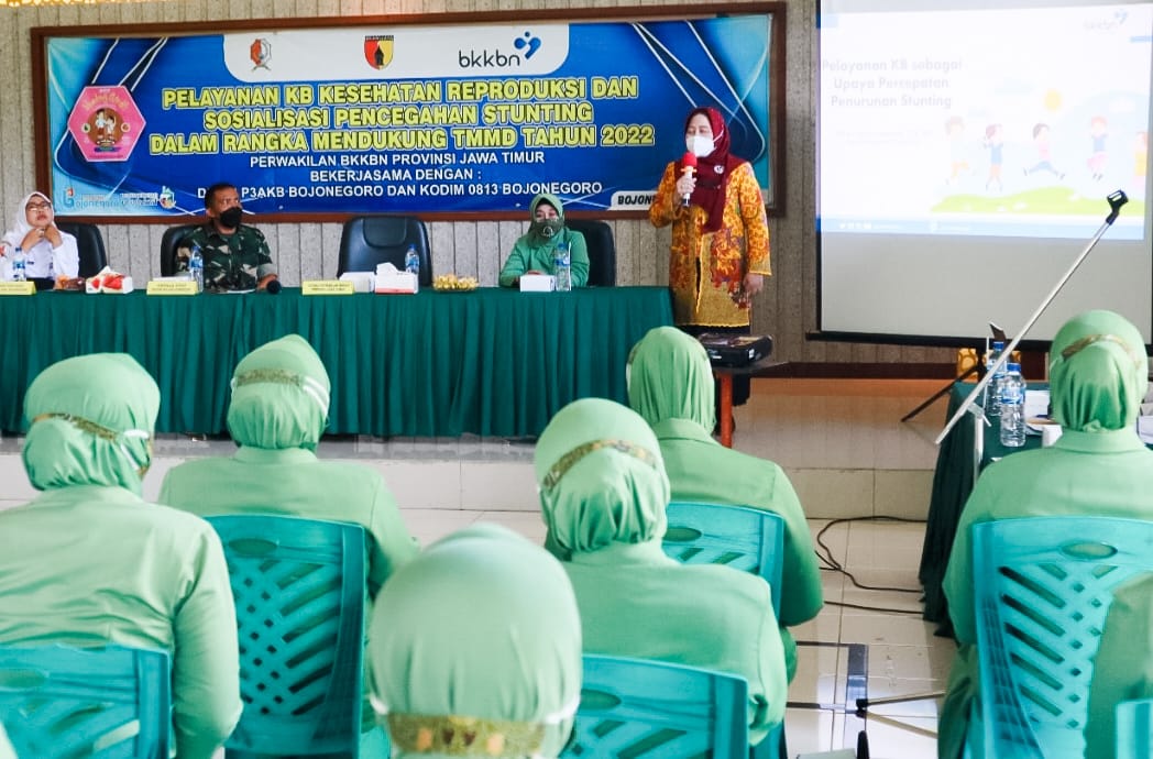 Bekerjasama dengan Pemerintah Kabupaten (Pemkab) dan Kodim 0813 Bojonegoro, Badan Kependudukan dan Keluarga Berencana Nasional (BKKBN) Provinsi Jawa Timur, menggelar Sosialisasi Pelayanan KB Kesehatan Reproduksi sebagai upaya penurunan stunting dalam rangka mendukung kegiatan TNI Manunggal Membangun Desa (TMMD) tahun 2022, Jum’at (3/6) pagi.