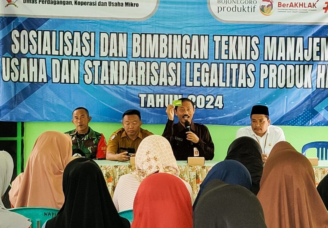 Dalam rangka menunjang kegiatan program TNI Manunggal Membangun Desa (TMMD) ke- 120 di Kecamatan Tambakrejo, Pemerintah Kabupaten (Pemkab) Bojonegoro melalui Dinas Perdagangan, Koperasi dan Usaha Mikro menyelenggarakan Sosialisasi dan Bimbingan Teknis (Bimtek) Manajemen Usaha serta Standarisasi Legalitas Produk Halal di Balai Desa Napis, Selasa (14/5/2024).