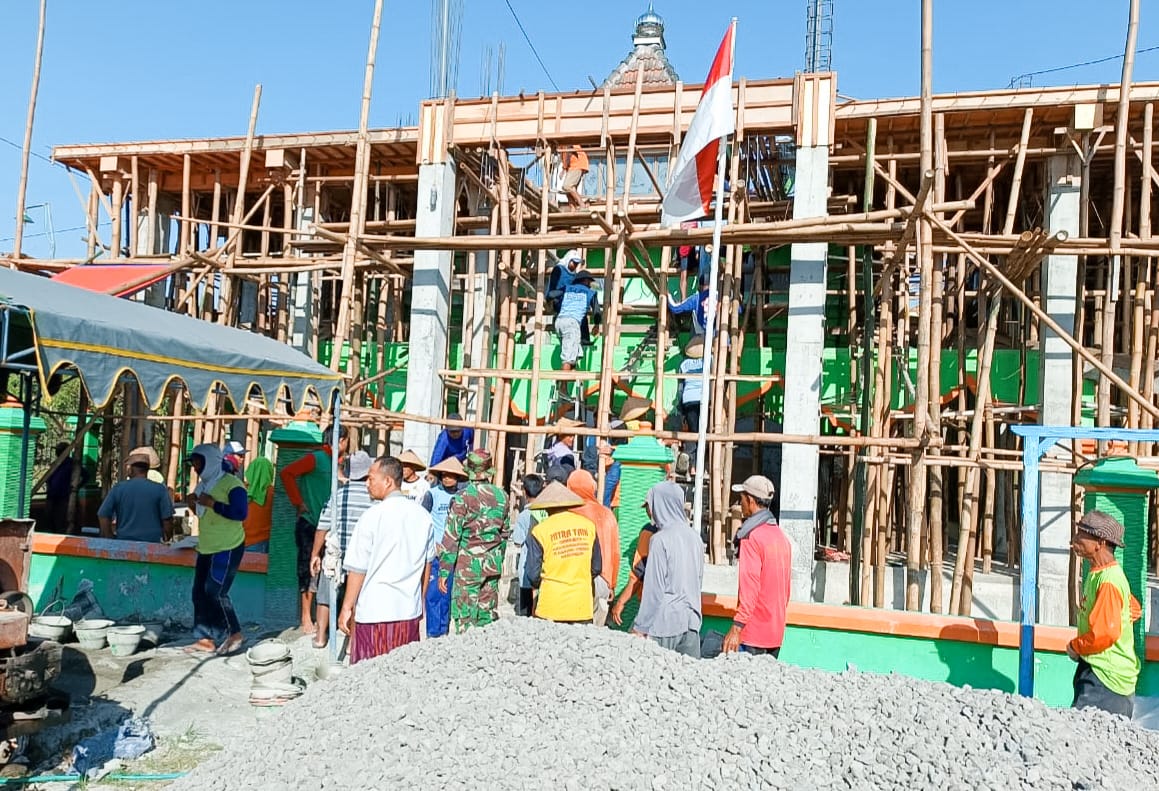 Bintara Pembina Desa (Babinsa) jajaran Koramil 09/Sumberrejo, Kodim 0813 Bojonegoro, bersama warga Dusun Megal, Desa Kedungrejo, Kecamatan Sumberrejo, gotong-royong melaksanakan Karya Bakti pengecoran dek lantai pembangunan Masjid Al- Ijtihat dusun setempat, Kamis, (25/8/2022).