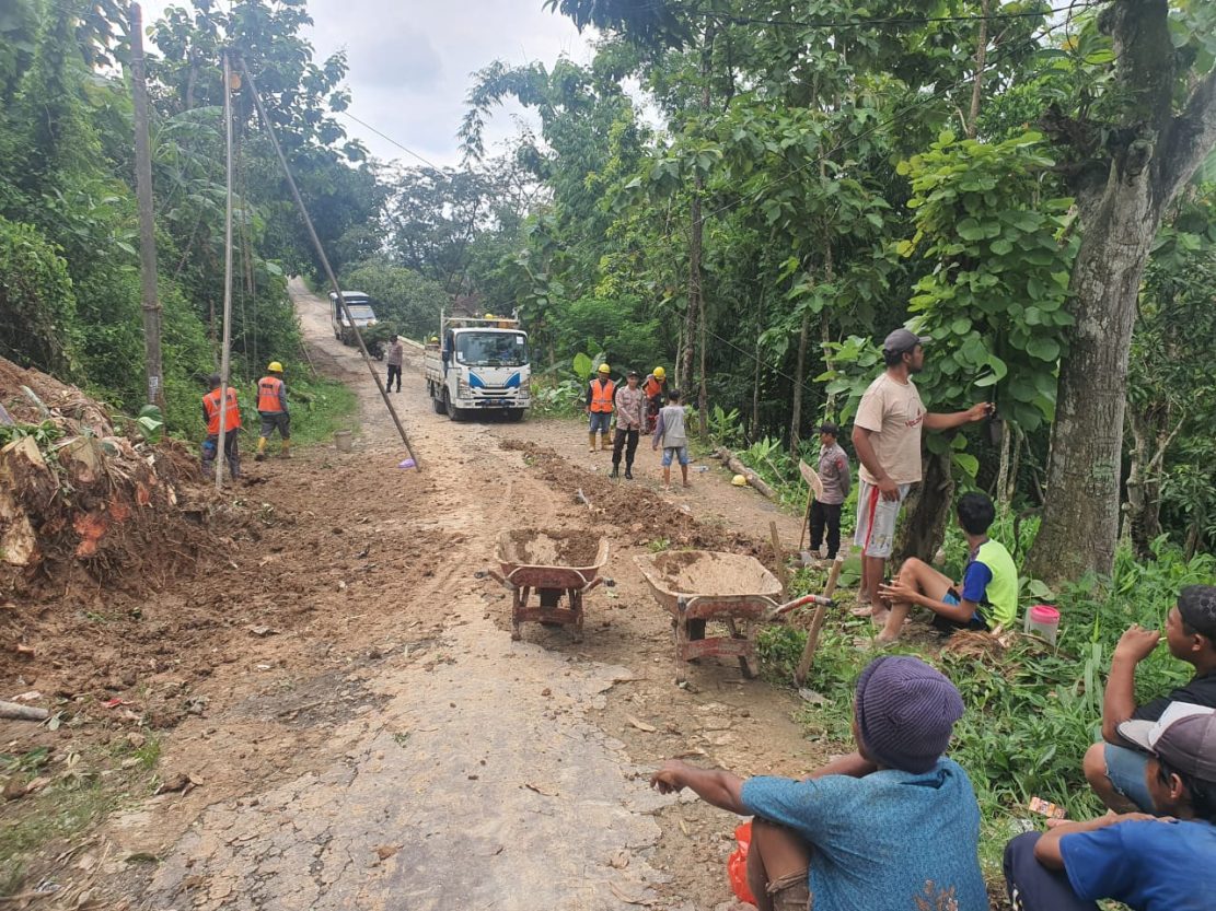 Dengan penuh semangat dan kekompakan, petugas dan warga bahu-membahu mengangkat material longsor, seperti batu, lumpur, dan pepohonan yang menutupi jalan.